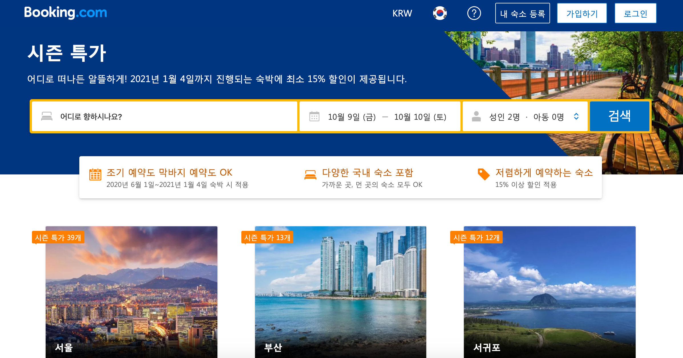 부킹닷컴 10월 할인코드 인기 가을 단풍 여행지 서울, 부산, 강릉, 제주도 감성숙소
