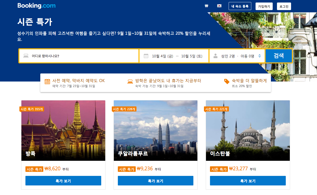 부킹닷컴 10월 할인코드 20% OFF 가을여행 인기도시 2019