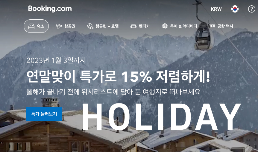 부킹닷컴 11월 프로모션코드 15% 할인 연말맞이 크리스마스 및 겨울방학 여행찬스 호텔예약