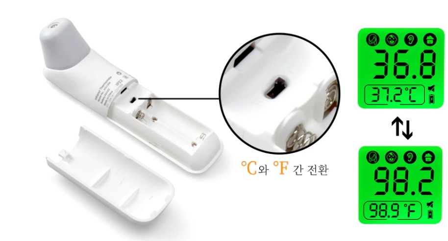 커버 탈부착시 자석이 있어서 쉽게 분리 부착가능하며, 온도 측정모드 자동으로 변환