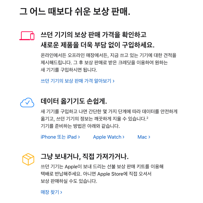 쓰던 기기의 보상 판매 가격을 확인하고 새로운 제품을 더욱 부담 없이 구입하세요. 온라인에서든 오프라인 매장에서든, 지금 쓰고 있는 기기에 대한 견적을 제시해드립니다. 그 후 보상 판매로 받은 크레딧을 이용하여 원하는 새 기기를 구입하시면 됩니다.