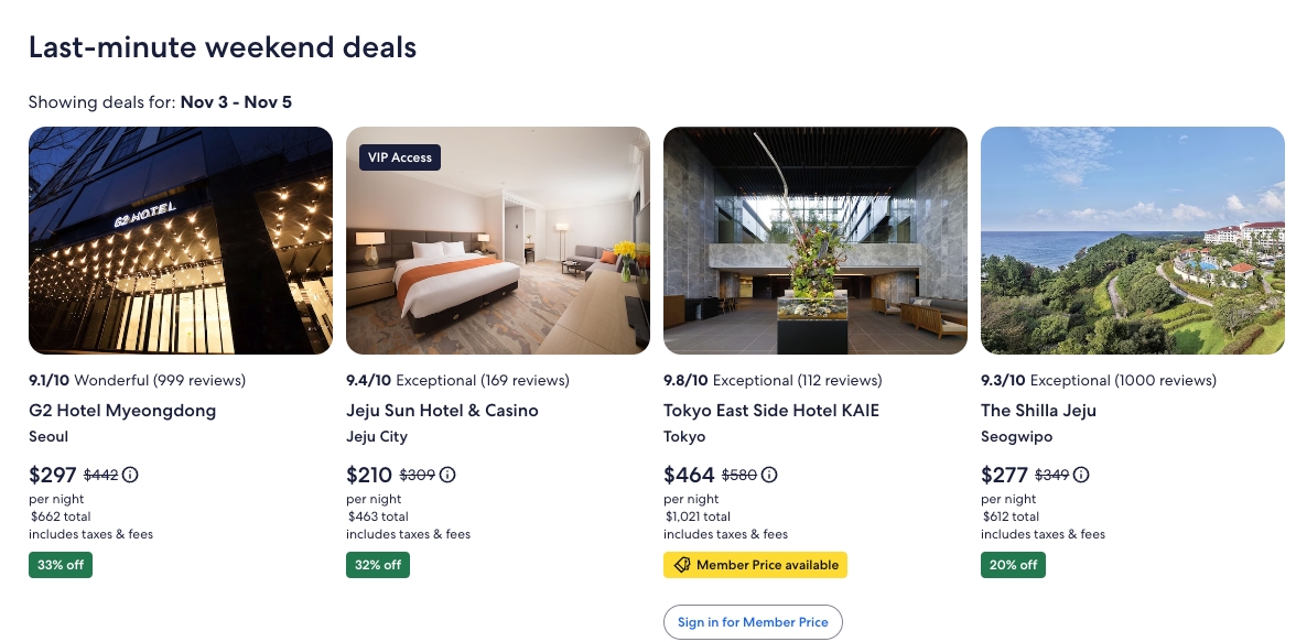 1. 다시 해외여행 지금 당장 또는 60일 뒤 떠날 휴가여행 겨울방학 할인받고 여행은 나중에 떠나 (취소가능 상품, 익스피디아 리워드로 10% 추가 할인 노란색 회원가 표시)