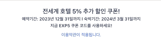 2. 한국 국내 익스피디아 3월 할인코드 5% 할인 EXP5 쿠폰 (KR, KRW, 3월 31일까지 적용가능. 체인호텔 제외 5% 호텔할인 )