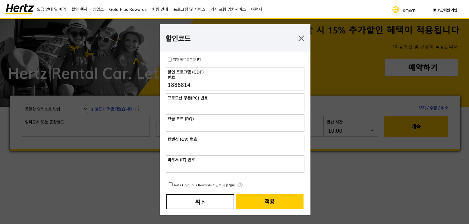 Hertz 허츠 11월 프로그램번호 12월 할인코드 10% 추가 할인