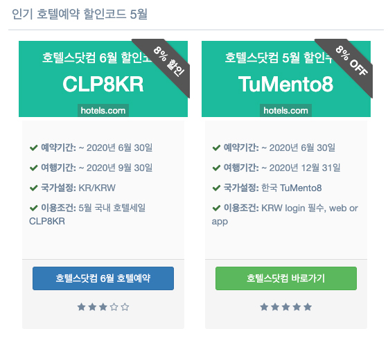 1. 한국 호텔스닷컴 5월 할인코드 5~8% 할인쿠폰 MOB5 CLP8KR TuMento8 (KR, KRW, 9월 30일까지 여행조건, 로그인시, 모바일환경 또는 웹환경 적용가능)