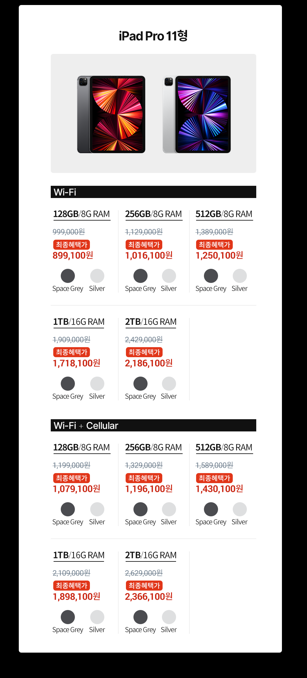 Apple 아이패드 프로 11형 3세대 M1칩, Wi-Fi+Cellular, 128GB / 256GB / 1TB / 2TB