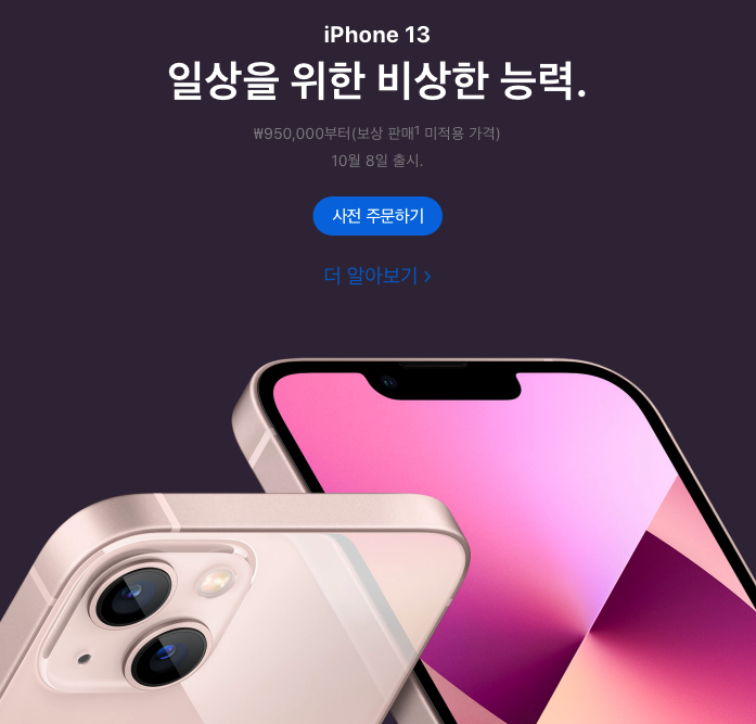 일상을 위한 비상한 능력 바로~ 아이폰13새 iPhone을 ₩1,350,000부터(보상 판매¹ 미적용 가격) 10월 8일 출시.아이폰13 / 아이폰13프로 / 아이폰 13미니 더 저렴하게 구입하는 법보상 판매 또는 카드사 프로모션 새 모델을 더욱 부담 없이 손에 넣으세요.Apple 공식사이트는 고객님들께 무료배송, 14일내 무료 반품 서비스, 인그레이빙 서비스를 제공새 아이폰13 더 저렴하게 구입하는 법 애플 공식홈페이지 아이폰13 및 아이폰 13 Pro 사전 주문하기 Apple iPhone 13 / 13 Pro / 13 mini