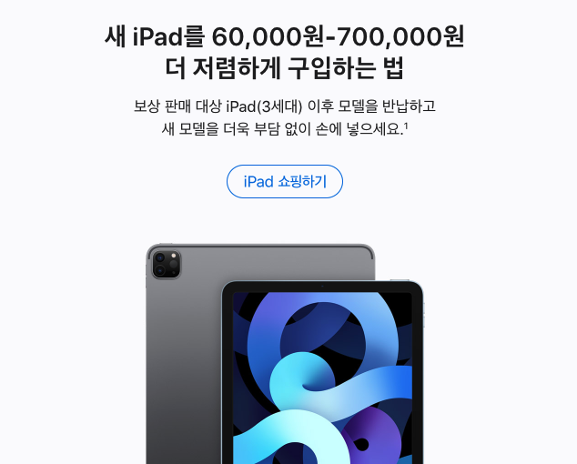 새 iPad를 60,000원-700,000원 더 저렴하게 구입하는 법 보상 판매 대상 iPad(3세대) 이후 모델을 반납하고 새 모델을 더욱 부담 없이 손에 넣으세요.¹