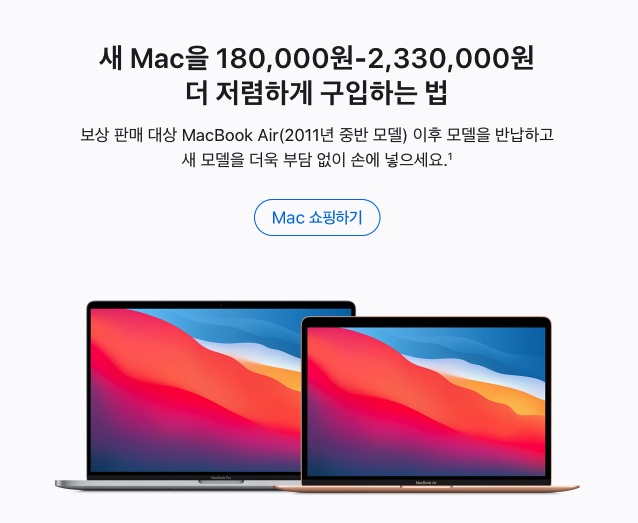 Apple 새 Mac을 180,000원-2,330,000원 더 저렴하게 구입하는 법 보상 판매 대상 MacBook Air(2011년 중반 모델) 이후 모델을 반납하고 새 모델을 더욱 부담 없이 손에 넣으세요.