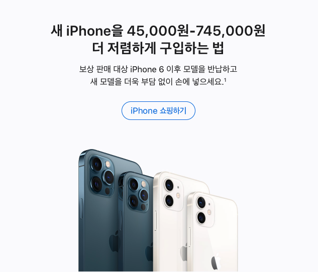 새 iPhone을 45,000원-745,000원 더 저렴하게 구입하는 법 보상 판매 대상 iPhone 6 이후 모델을 반납하고 새 모델을 더욱 부담 없이 손에 넣으세요.