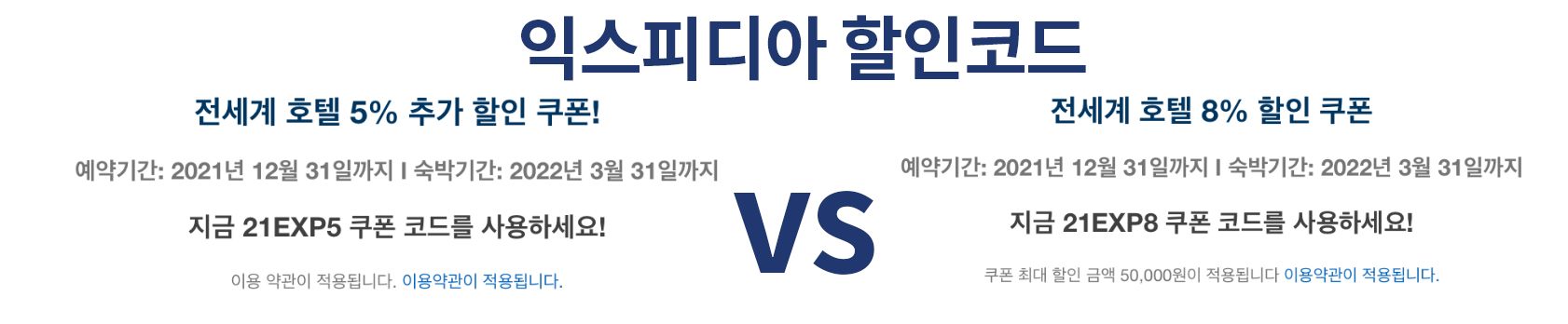 2. 한국 국내 익스피디아 10월 할인코드 5% 할인 21EXP5 쿠폰 (KR, KRW, 12월 31일까지 적용가능. 체인호텔 제외 5% 호텔할인, 호텔만 할인도 가능하며 5만원 이상 할인을 원할때)