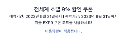 3. 2023년 5월 - 6월 호텔예약 국내 및 현지지역 지금바로~ 주요인기 호캉스 명소 익스피디아 할인코드 7~9% 할인 EXP7 / EXP9 휴가 특가 국내 쿠폰적용 (KR. KRW, 로그인시 적용)
