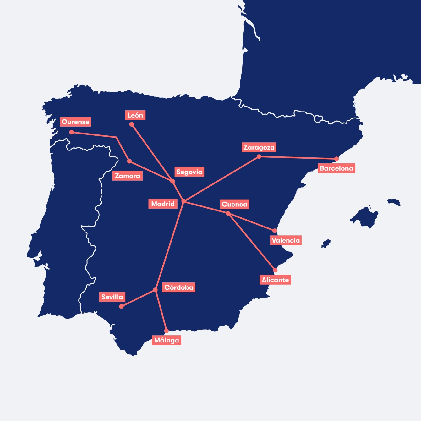 - Madrid – Barcelona- Madrid – Valencia- Madrid – Sevilla- Madrid – Granada- Madrid – Pamplona- Madrid – Logroño- Madrid – León- Barcelona – Málaga- Barcelona – Granada- Madrid – Logroño