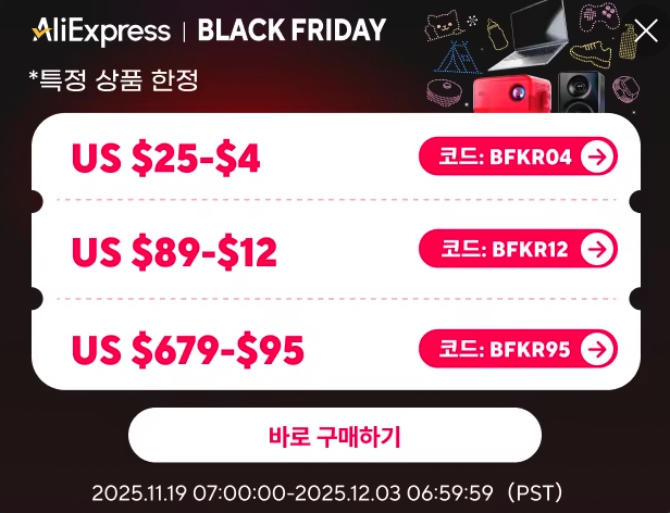 AliExpress Promo Coupon Code 2025 Black Friday AliExpress Promo Coupon Code 2025 Black Friday 공유하기 게시글 관리 3월 할인코드쿠폰 다잘사 DAJALSA 저작자표시 비영리 변경금지 (새창열림)